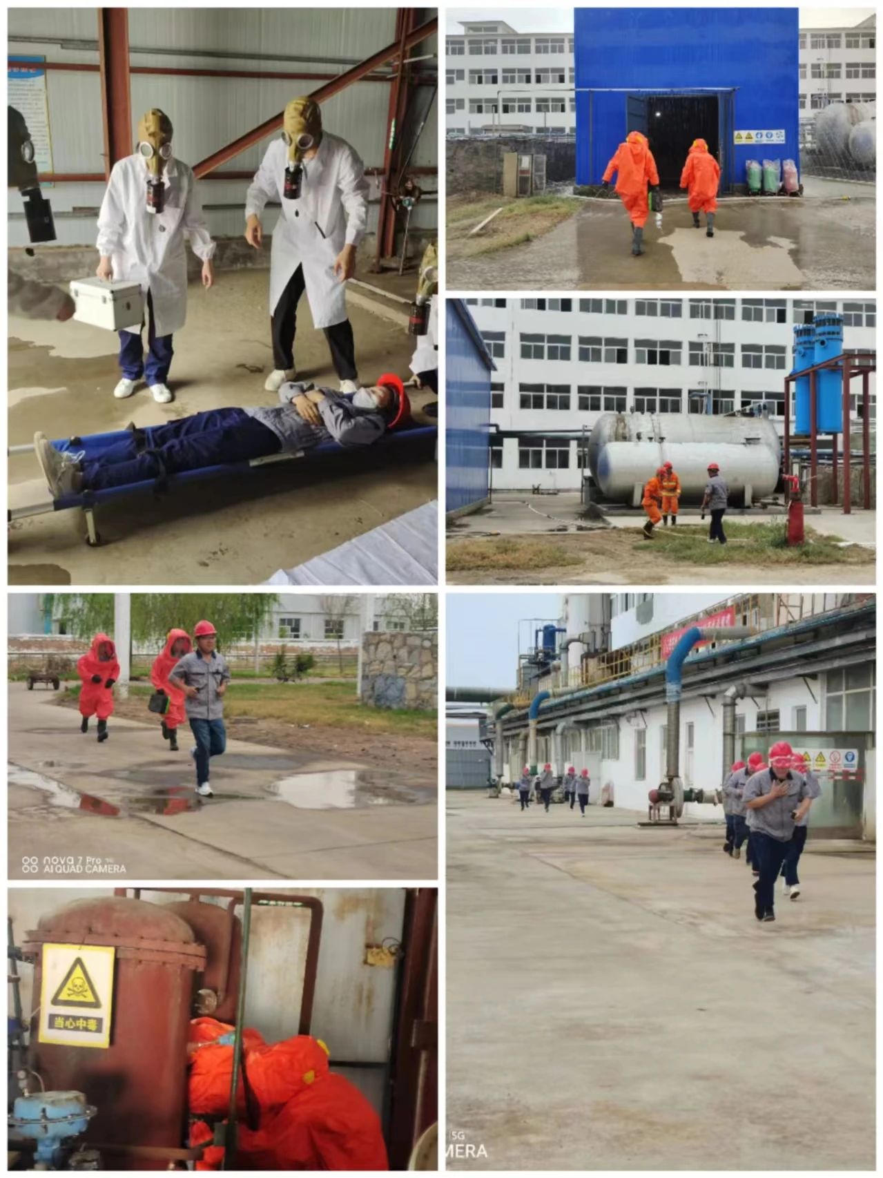 整个演练队伍按照综合预案要求,,,共分为七个小组进行,,,分别为警戒组、、疏散组、、救护组、、、、侦查组、、稀释组、、、堵漏组、、、、环保组。。。。安全部安全员巡检氯气气化间时,,,,发现操作人员吕红梅晕倒在气化间门口里面,,,,并闻到刺鼻的氯气味道,,她立即向中控室值班人员报警,,,并通知中控室关闭氯气气瓶气动阀,,,停止供气。。中控室人员随即向公司总指挥请求启动公司级应急预案,,然后一场公司氛围内的应急救援行动迅速有效展开,,,,围绕最终堵漏成功的应急战役打响。。。